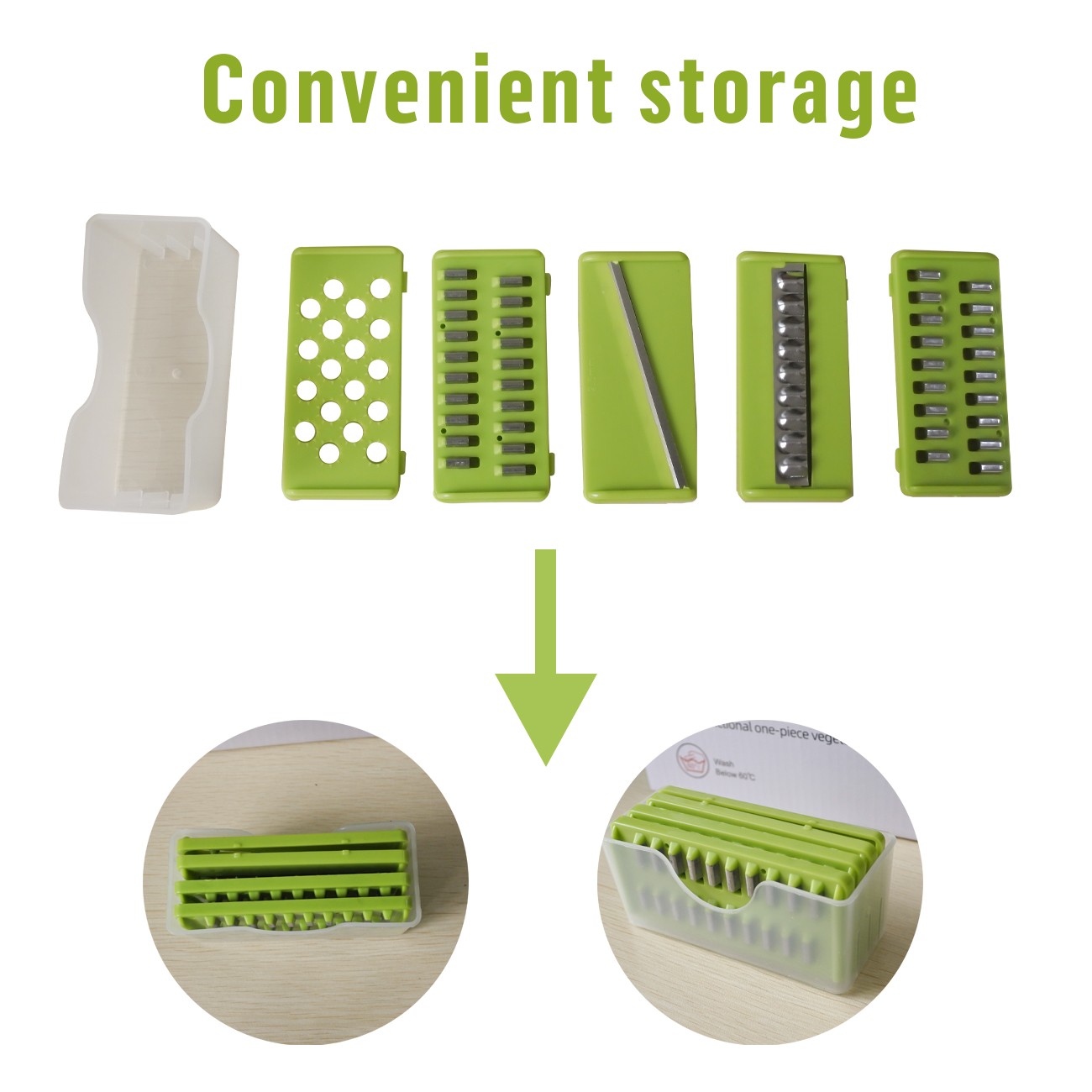 ReinigungsbürsteNach dem Gebrauch können Rückstände von Gemüse und Obst am Messer haften bleiben. | vegetable cutterVerwenden Sie den Handschutz und zerkleinern Sie Ihre Zutaten gründlich. Keine Schnitte und Druckstellen mehr beim Zerkleinern von Möhren, Kartoffeln und anderem Obst und Gemüse. Alles wird direkt im Behälter aufgefangen, was das Kochen erleichtert. | EntwässerungskörbeGeschnittenes Gemüse kann in einen Abtropfkorb gelegt und in Wasser gewaschen werden, damit das Wasser schnell abläuft und die Lebensmittel trocken und frisch bleiben. |